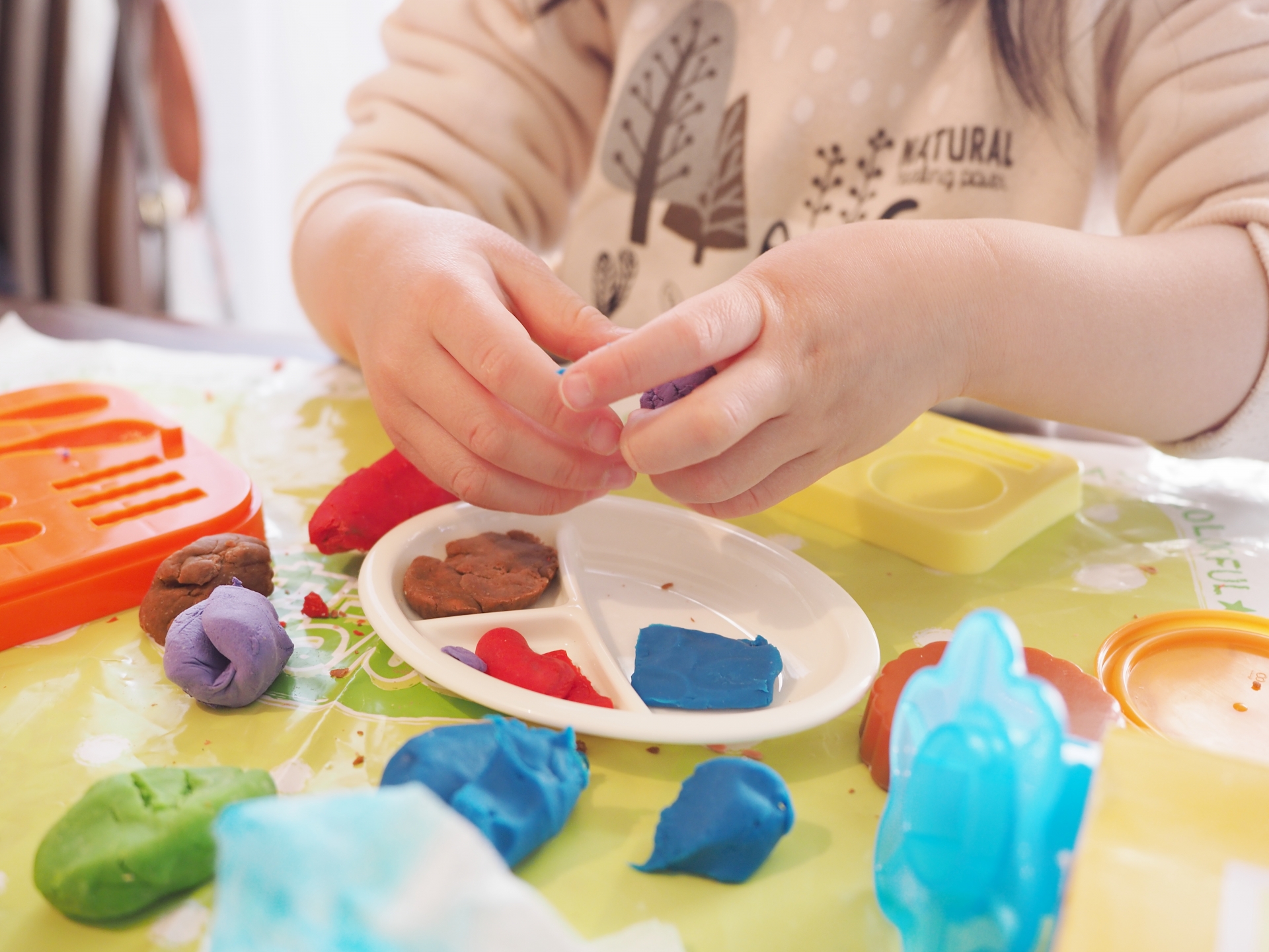園内では知育玩具が勢揃い。散らかしても全く問題ないです。お片付けのお手伝いも一緒に学べる